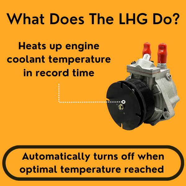 The HeatStroke LHG adds 8kW - 16kW (27,000 - 55,000 Btu) of additional heat to your engine coolant circuit and heater core instantaneously based on engine RPM.