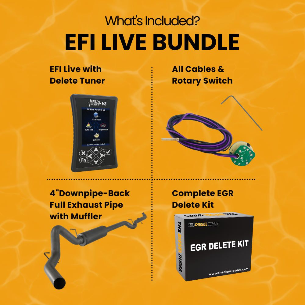 1) EFI Live Tuner and Delete Tune Software (not-preloaded) and all required accessories. Rotary switch to change power levels