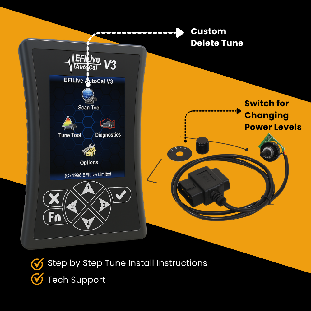 1) EFI Live Tuner and Delete Tune Software (not-preloaded) and all required accessories. Rotary switch to change power levels