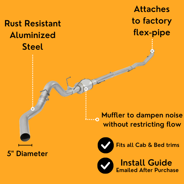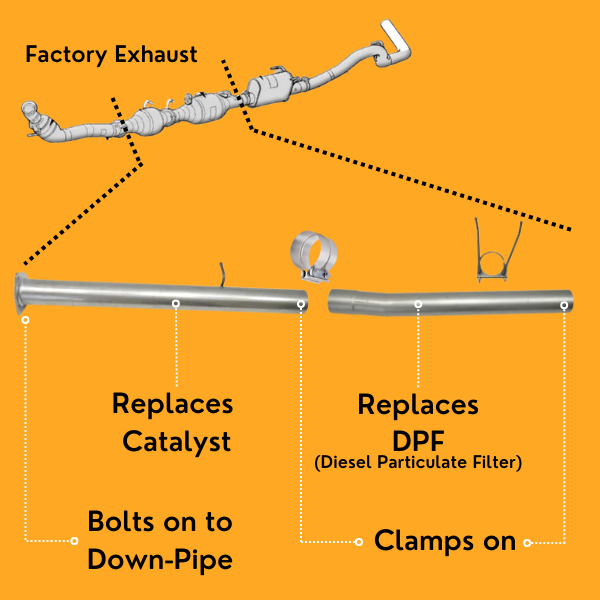 Our kit includes a DPF/CAT delete pipe that bolts in place of the original DPF and CAT in the exhaust system.