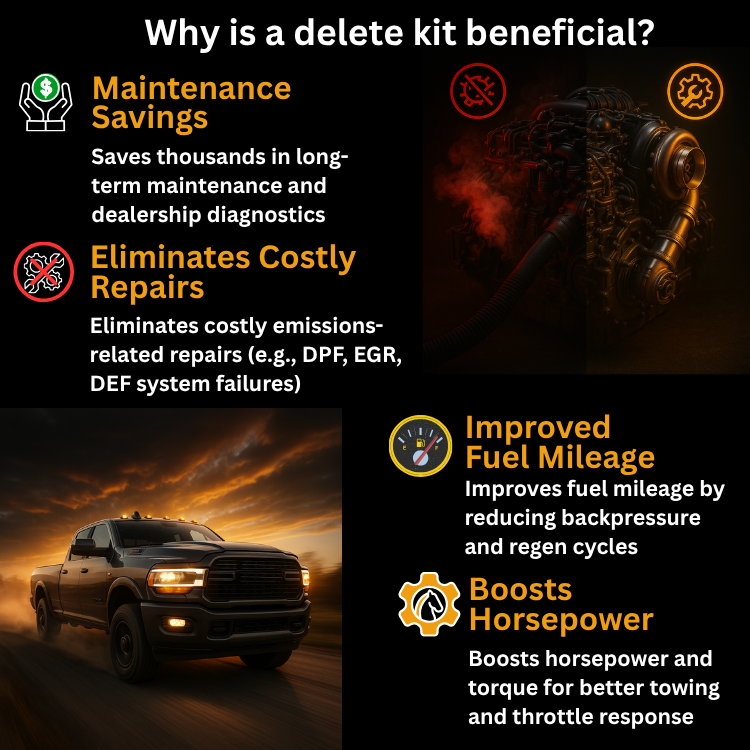 Delete kits are for off-road and race-use only. They are not legal for highway use in the U.S. or Canada, especially in states with strict emissions laws (like California). Many customers in rural areas or provinces without emissions testing still choose to delete for reliability and performance.